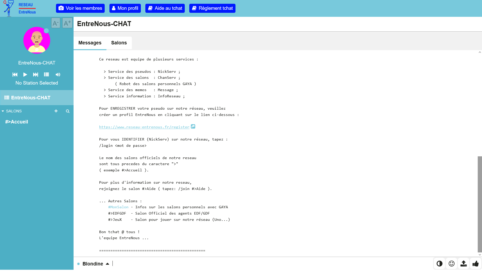 Une fois connecté à notre réseau, il vous suffira de cliquer sur votre salon favori pour le rejoindre grâce au menu de gauche du Webchat EntreNous.